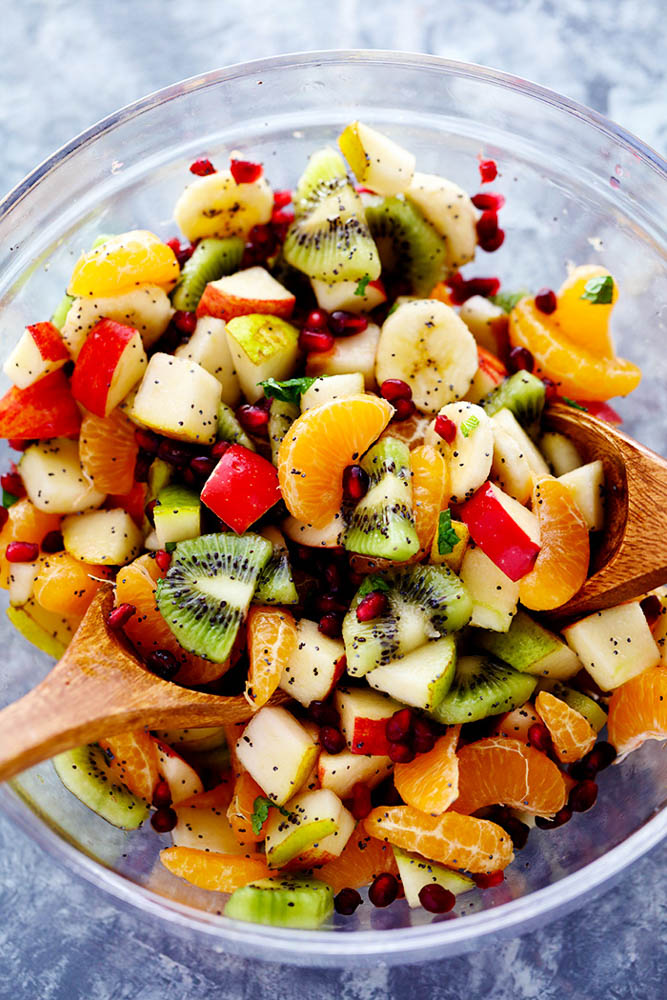 In a large boel combine apple, pear, bananas, kiwi, clementines, and pomegranate seeds. Lightly toss.