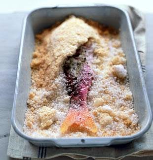Pour salt into a large bowl and add the egg whites. Mix until salt is evenly moistened. Spread 1/3 of the salt over the bottom of a large baking dish. Place fish on top and cover it with the rest of the salt, evenly.