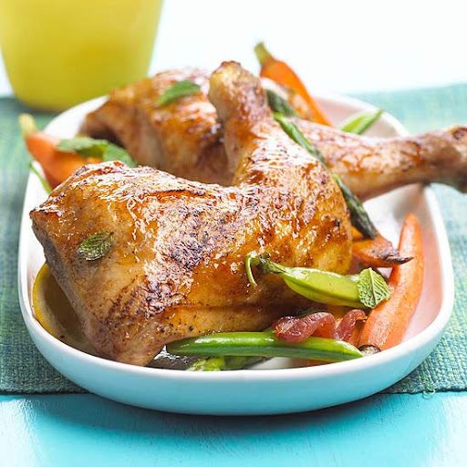 3. Meanwhile, for vegetables, in 12-inch skillet cook bacon over medium-low heat until crisp. Drain on paper towels, reserving drippings in skillet. Add carrots to drippings; cook and stir 5 minutes. Add peas and asparagus; cook and stir 6 to 8 minutes or until vegetables are tender. Remove from heat. Crumble bacon. Stir in mint and bacon. Serve with chicken. Makes 4 servings.