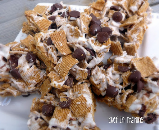 Add Golden Grahams and stir until they are all well coated. You can chose to crush some up before adding them if you want some smaller pieces. Next stir in chocolate chips.