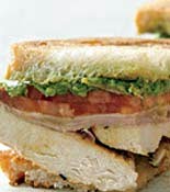 4.Top each of 4 toasts with a chicken breast, 2 ham slices, 1 cheese slice (for melted cheese, broil the sammies for 1 minute), 2 tomato slices, salt, pepper and 2 bacon strips. Spread the lettuce puree on the remaining toasts and set on top. Slice the sammies into 4 triangles each