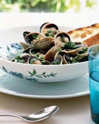 Here, deliciously briny cockles are simply enhanced with white wine and scallions in a savory broth. To turn this first course into a more substantial meal, toss the cockles and broth with pasta and chopped tomatoes.