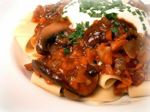 Add remaining butter to the pan and sprinkle flour over the top, quickly stirring in. Simmer for another 3 to 4 mins. Taste, and season further with salt & pepper if needed. To serve, get yourself a bowl of warm, buttery egg noodles, spoon the mushroom bourguignon over the top, and garnish with a dollop of sour cream and a sprinkling of chives or parsley. Polenta could also be a delicious option to noodles.