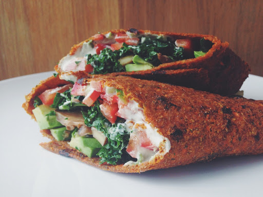 The wraps I made above are stuffed with marinated mushrooms, avocado, red peppers, kale, and cashew tzatziki.