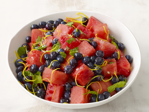 Bring 1/4 cup each sugar and water to a simmer in a saucepan. Remove from the heat, add 3 mint sprigs and steep 10 minutes. Discard the mint; add the zest and juice of 1 lemon and a pinch of salt. Toss with 2 cups blueberries and 3 cups cubed watermelon. Let stand 15 minutes. Top with chopped mint.