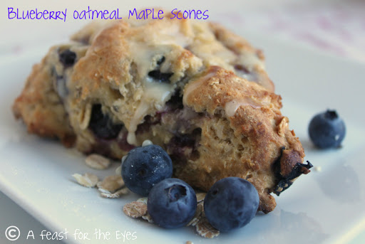 I created this scone recipe to feature BetterOats brand instant oatmeal. Using a combination of white and whole wheat flour, substituting pure maple syrup for white sugar, and a reduced amount of butter I was pleased that the scones were tender with just the right amount of sweet. Fresh blueberries are showcased in this tender pastry, with just a hint of cinnamon. These were drizzled with a simple maple glaze, for just a touch of sweet. These can be easily frozen, individually, before baking for an easy breakfast treat on-the go-- without the guilt!