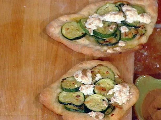 Place a clean pizza stone in the oven and preheat to 450 degrees F. Divide zucchini mixture among the 8 rounds of dough, distributing it evenly, and dab a little ricotta on each one. Bake until light golden brown, about 14 to 16 minutes, and serve hot or at room temperature.