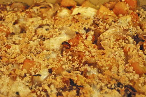 Combine onion and squash in a bowl. Season with sage, salt and pepper. Place squash mixture in an 11 x 7 inch pan. Bake for 20 minutes. Top with Gorgonzola, then bread crumb mixture. Bake an additional 10 minutes