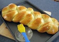 Dissolve yeast in warm water. Soften butter, add to warm milk. Stir in salt and sugar. Mix in yeast. Add 2 eggs. Mix in 2 1/2 c flour. Add another 2 1/2 c flour. Use remaing flour on board while kneading. Grease bowl, add dough, cover with towel and rise 1 hr. Grease 2 large cookie sheets. Punch down center of dough. Knead, cut in half, braid dough and cover with wax paper & towel. Sit for 50 mins. Mix egg and water, Brush bread - 350 30 mins.