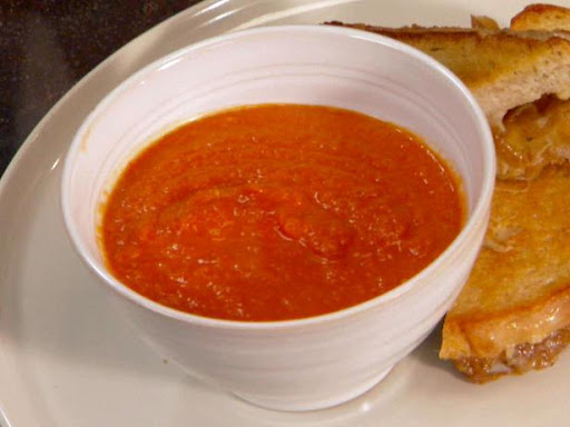 Heat a soup pot over medium heat. Add the butter and cook until foaming. Add the crushed red pepper and garlic and saute for 1 minute. Add the tomato paste and cook for 1 to 2 minutes. Then add the sherry. Cook until all the liquid has evaporated and the alcohol has cooked off, 1 to 2 minutes. Add the roasted vegetables, crushed tomatoes and 1 cup chicken stock. Season with salt and pepper and bring to a simmer. Let simmer for 15 minutes.