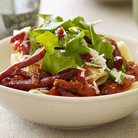 Add the remaining EVOO, 1 turn of the pan, to the skillet. Add the garlic and cook over medium heat for 2 minutes. Stir in the crushed red pepper, then the pureed roasted bell peppers. Stir in the tomatoes and oregano and heat through, 2 to 3 minutes. Stir in the reserved pasta cooking water. Add the pasta, parsley and cheese; toss. Top with the arugula and sopressata sticks.