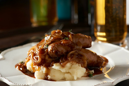 To prepare the gravy, add the butter and onions to the skillet on the stovetop and sauté until soft and brown. Sprinkle in the flour, then add the beef broth, thyme, and gravy browning sauce. Bring to a simmer and stir until thickened, about 2 minutes. Add the cooked sausages to the skillet and simmer for 2 minutes more. Serve the sausages and gravy over the mashed potatoes.