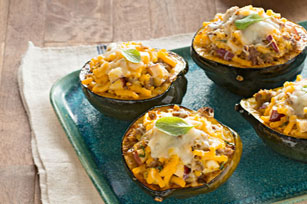 SCRAPE pulp from squash halves into large bowl, leaving 1/4-inch-thick shells. Add Dinners, sausage, chopped sage and apples to squash; mix well. Spoon into squash shells; top with shredded cheese.