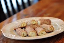 Soften cheese. Flatten bread and remove crust. Spread with cheese and roll-up. Cut in 2 or 3 pieces. Dip in melted butter and roll in a mixture of cinnamon and sugar. Bake in 450 for 5-7 minutes. May be frozen.
