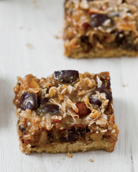 Bake the bars for 35 to 40 minutes, until lightly browned on top. Transfer the pan to a rack and let the bars cool to room temperature, then refrigerate until firm, about 1 hour. Carefully remove the bars from the pan and peel off the paper. Cut into bars and serve.