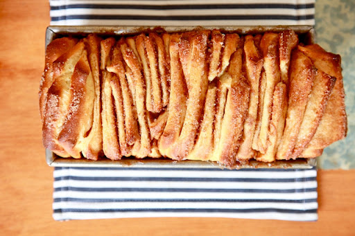 Slice the dough vertically, into six equal strips. Stack the strips on top of one another and slice the stack into six equal slices once again. You'll have six stacks of six squares. Layer the dough squares in the loaf pan like a flip-book. Place a kitchen towel over the loaf pan and allow to rest in a warm place for 30-45 minutes or until almost doubled in size.