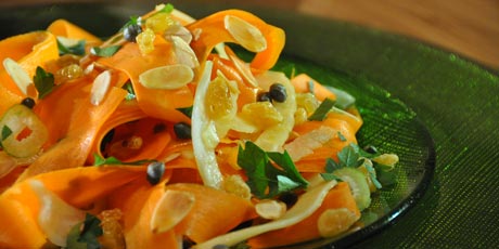 Put the carrots, fennel, capers and wine-soaked raisins in a large bowl. Pour the white wine dressing over the carrot and fennel salad. Add the chopped parsley, toasted almonds, toss and serve.