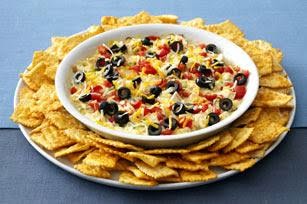 BAKE 25 min. or until heated through. Top with remaining shredded cheese, tomatoes and olives. Serve with crackers.