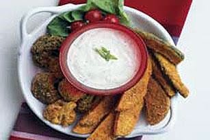 PREHEAT oven to 425°F. Beat egg in small bowl. Dip vegetables in egg; shake in coating mix.
