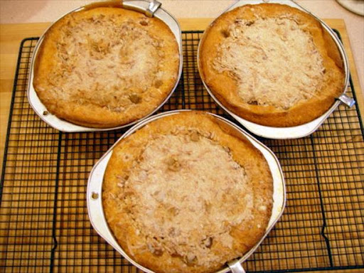 Pour coffee cake batter mixture into 3 greased and floured 8" cake pans. Sprinkle topping equally on top of batter in all 3 pans. Bake at 350° for 35 minutes.