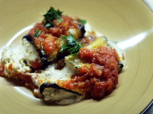 A few years ago we had our first helping of Eggplant Involtini at a restaurant in Chicago. The meal overall was pretty good, but we were really excited about the eggplant appetizer. It combined three of our favorite things - eggplant, ricotta, and tomato sauce - into one dish.
