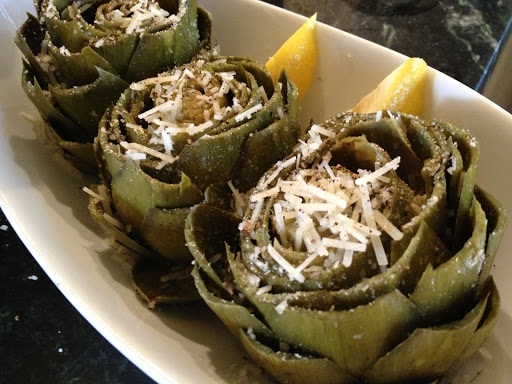 Drizzle melted butter over the leaves*. Generously sprinkle each artichoke with seasonings, Parmigiano-Reggiano cheese and bread crumbs. Spueeze fresh lemon over each artichoke.