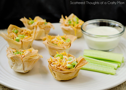 You can prepare the chicken a day or two ahead of time, but you'll need to rewarm the chicken before adding it to the phylo cups. To make the Buffalo Chicken cups, I used phylo dough sheets cut into squares and baked in a muffin tin according to the package directions. (To make it even simpler, you can use ready made phylo cups or even those little tortilla chip scoop/bowls.) Add the warm Creamy Buffalo Chicken to the phylo cups, top with shredded cheese and diced green onions. For an additional kick, you can add an extra dash of buffalo sauce before the shredded cheese. Serve with celery sticks and blue cheese dressing. (You can thank me later :) ...) - See more at: http://www.scatteredthoughtsofacraftymom.com/2013/09/Buffalo-chicken-recipe.html#sthash.p4MKUsKH.dpuf