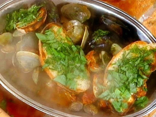 Place a 12 to 14-inch saute pan over medium high heat and heat the oil until smoking. Add the scallions, the garlic and the chili flakes and cook until soft and light golden brown, about 1 minute. Add the clams and mussels and stir to mix. Add the wine and tomato sauce, cover and cook until clams and mussels are all open, about 5 to 6 minutes. Meanwhile, grill or toast the bread until quite dark. Remove and drizzle with extra virgin olive oil. Sprinkle with chopped herbs and some coarse salt. Remove lid from clam pan, add parsley and stir through. Divide the broth, the clams and the mussels among 4 bowls, top with bruschetta and serve.