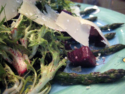 Allow the beets to cool 5 minutes and then peel them. Cut the peeled beets into 1/2-inch dice and place in a kitchen bowl. Dress the beets with the vinegar and oil and season them with salt and pepper. Add the frisee to the beet bowl and toss to mix well. Arrange the beet and frisee mixture over the asparagus, shave shards of Parmigiano over and serve.