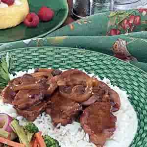 In a small bowl, combine the first five ingredients until blended; set aside. In a large skillet, brown pork in oil on all sides. Stir in the gravy mixture, mushrooms and onion. Bring to a boil. Reduce heat; cover and simmer for 10-15 minutes or until meat juices run clear and vegetables are tender. Serve over rice. Yield: 2 servings.