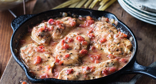 3. Heat remaining 1 tablespoon oil in skillet. Add onion; cook and stir 3 minutes or until softened. Stir in remaining 1 tablespoon flour. Add tomatoes, stock and reserved seasoning mixture; bring to boil, stirring occasionally. Reduce heat to medium-low; simmer 5 minutes. Stir in half-and –half. Return chicken to skillet; cook until heated through. Serve with pasta.
