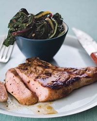 Grilled Pork Chops with Anchovies and Swiss Chard