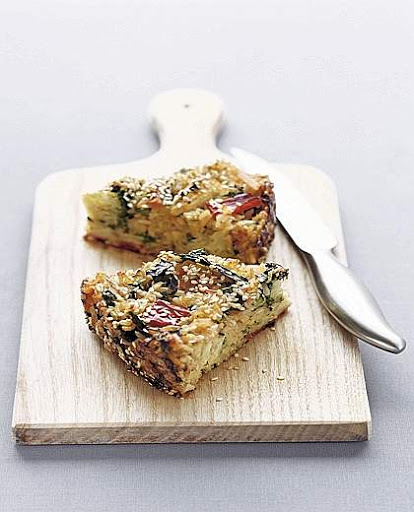 Butter and dust an oven pan large enough to hold the ingredients (figure a pie a little more than an inch, 2.5 cm, high), then pour them out into it. Bake for about 10 minutes, then flip the pie onto a serving dish and remove the pan. Let it cool, and serve it slightly warm, cut into wedges or squares.