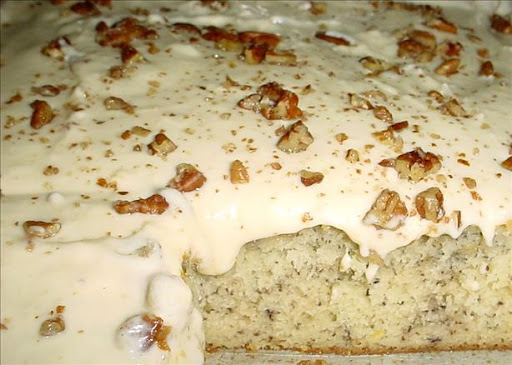 Wonderful cake. Moist and flavorful. I made it exactly as printed, baked in two 8X8 pans, buttered only (no flour) it turned out just right. Next time I'll make it as a 3 layer (round) cake. I cut the confectioners sugar by 1 cup because it tasted sweet enough, but when eating the cake, the sweetness was less obvious. I don't know why some reviews said it tasted like banana bread, mine does not. Maybe they aren't beating it enough? Thanks for sharing!