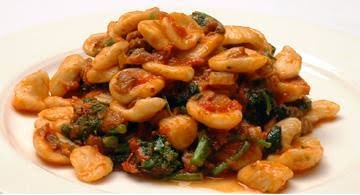 Prepare the pasta dough according to the recipe. Cut the dough into four equally-sized pieces and roll each into a ¾-inch thick dowel. With a very sharp knife, cut small disks of 1/8-inch thickness from each dowel, and press the center of each disk lightly with your thumb to form a saucer shape. Place the orechiette on a sheet tray that has been sprinkled with semolina, cover with a clean dish towel and set aside.