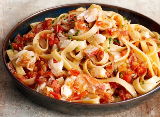 In a 12 to 14-inch saute pan, heat olive oil until smoking. Add onion, celery, potato and garlic and saute until golden brown. Add tomatoes, wine and saffron and bring to a boil. Lower heat and simmer 1 minute. Cook pasta according to package instructions and drain. Add lobster to tomato sauce in pan and toss through. Add hot pasta to pan and add chives. Toss to coat and serve immediately.