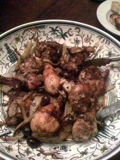 Combine the chicken pieces, fennel wedges and fronds, garlic, olives, fennel seeds, chili, pepper, wine, and olive oil in a 10- x 14-inch roasting pan. Refrigerate for 2 to 48 hours, tossing once in a while.