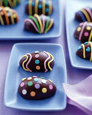 5. To decorate: Pipe designs on eggs with decorating icing. Use remaining melted chocolate or decorating frosting and a toothpick to glue candies onto eggs.