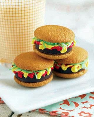 2. Place a small dab of vanilla frosting on flat side of 12 cookies. Top each with a peppermint candy “burger,” pressing lightly to adhere. Pipe on yellow and red frosting to resemble mustard and ketchup. Sprinkle with coconut “lettuce,” pressing to adhere. Place a small dab of vanilla frosting on flat side of remaining cookies and press, frosting side down, gently on coconut.