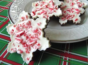 In a heat safe bowl, add brown chocolate and half of the vegetable oil. I used candy melts because it’s what I had on hand. Melt chocolate at 50% power in 30 second intervals. Stir well after each heating. When fully melted, stir in half of the peppermint extract. Pour milk chocolate (or whichever variety you’ve chosen) onto prepared pan and spread out evenly. Alternately, divide equally among molds or cookie cutters. I used a small cookie scoop to divide among my snowflake cavities. Sprinkle with a small amount of candy cane pieces, preferably some of the smaller pieces. Transfer to the fridge for 30-60 minutes or until fully set and hardened.