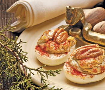 Servings: 12. Serving size: 2 egg halves. Per serving: 142 calories, 7 g protein, 10.6 g fat, 4 g carbohydrates, 0.7 g dietary fiber, 163 mg sodium, 1.7 g sugars, 187 mg cholesterol