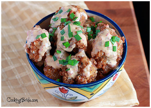 Double battering the shrimp ensures a super crispy coating. And the sauce is creamy, tangy, and spicy. According to The Husband, it was the best thing I have ever fried.