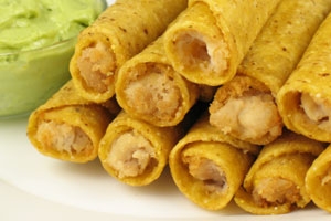 Heat tortillas on griddle until pliable. Place thin strip of filling lengthwise on tortillas and roll tightly in flute shape. Secure with wooden toothpicks. Mist taquito with cooking oil. Repeat with remaining ingredients.
