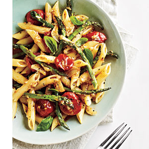 2. Heat a large nonstick skillet over medium-high heat. Add oil to pan; swirl to coat. Add asparagus; sauté 3 1/2 minutes. Add garlic; sauté for 1 minute. Add tomatoes; cook for 6 minutes or until tomatoes are tender.