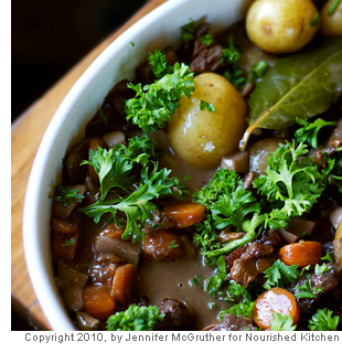 5. Add browned beef back into the pot along with one pound small fingerling potatoes. Note: To reduce additional calories, pat down the browned beef with a paper towel to remove excess bacon fat before adding it back into the mixture.
