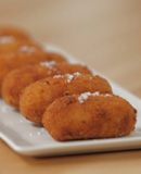 3. Take a rounded tablespoon of the cooled filling and roll it in your hands to make a small cylinder. Dredge the cylinder in the remaining ½ cup flour, then in the eggs and then in the breadcrumbs. Repeat with the remaining filling.