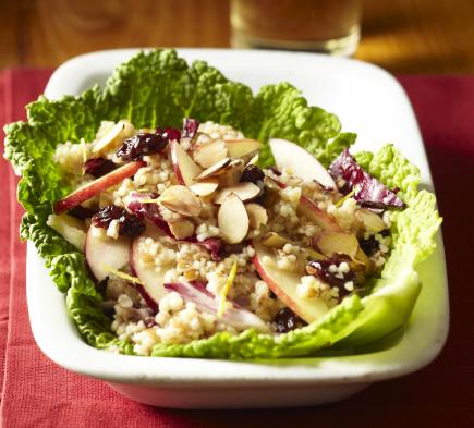 Just before serving, stir the apples into couscous mixture. To serve, arrange cabbage leaves on salad plates. Spoon apple salad on top of the cabbage. Sprinkle with almonds.