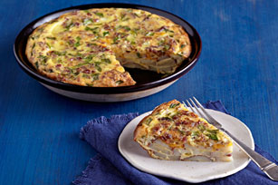 PLACE potatoes in 9-inch pie plate sprayed with cooking spray; top with cheese, bacon and onions.