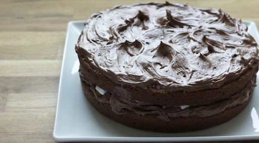 6. Remove the cooled cakes from the pans, peel off the parchment and place one layer on a serving tray or cake stand. Spoon and spread about one-quarter of the icing on top of the first layer, sprinkle with half of the marshmallows (if using), then top with the second cake layer. Use the rest of the icing to frost the top and sides of the cake (or just frost the top of the cake, as shown) and finish with the remaining marshmallows (if using), then garnish with chocolate curls or grated chocolate (if using).