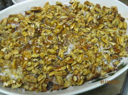 4 mix up remaining butter sugar and pecans. spread over the whole cooked dish.